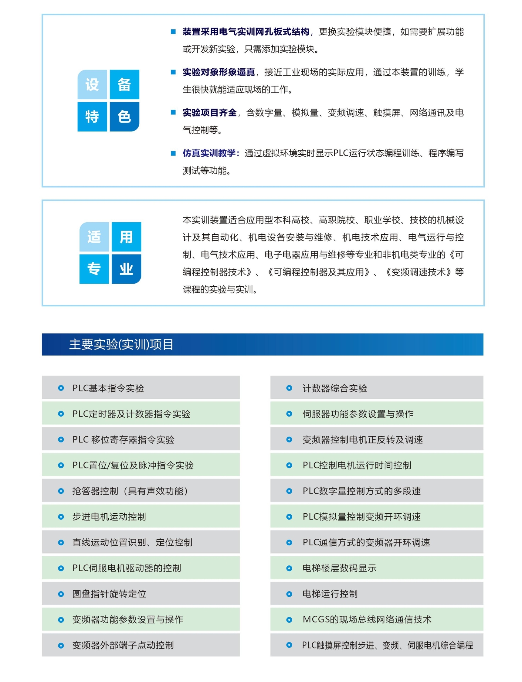 本实训装置集PLC、触摸屏组态和步进控制、伺服控制、变频控制等常用的电机控制设备于一体。通过PLC编程对不同电机的控制,并以丝杆、圆盘仪表、风扇等实物呈现其运行控制状态。