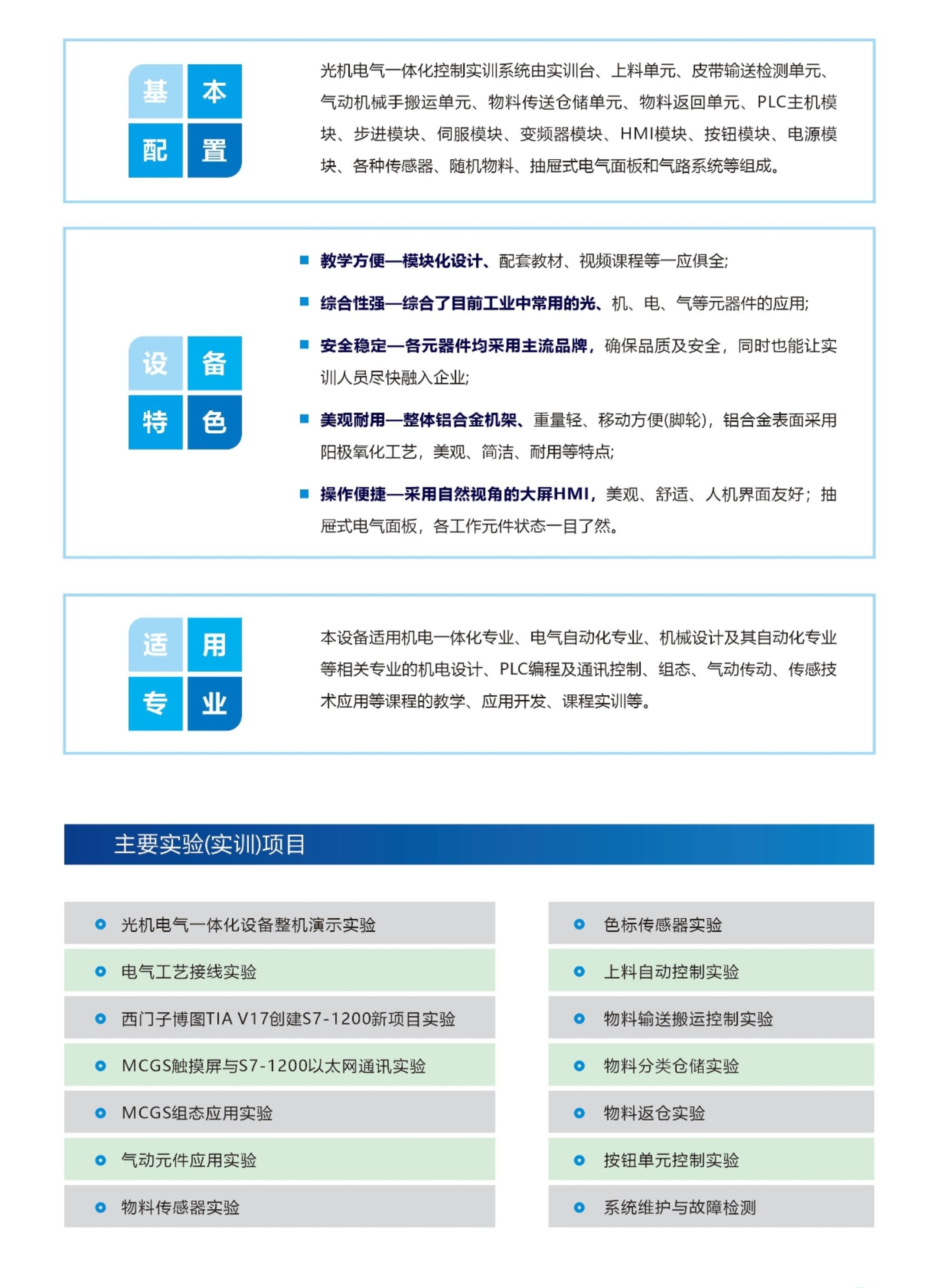 本实训系统采用模块化设计,包含上料单元、皮带输送检测单元、机械手(气动)搬运单元传送仓储单元、机械手自动循环送料单元、供气单元等。