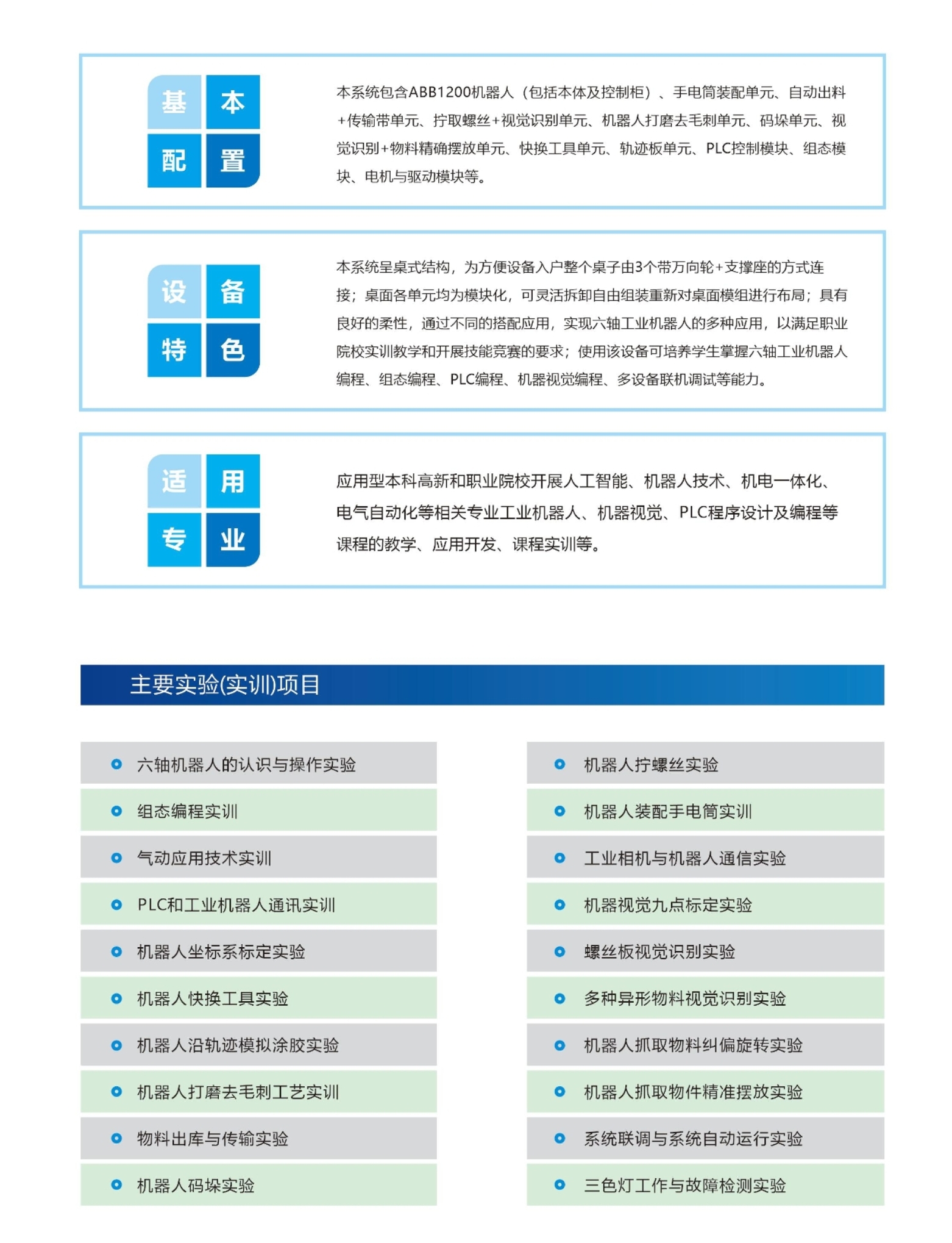 六轴工业机器人综合实训系统以《工业机器人操作与运维职业技能等级标准》中的考核内容为设计标准。系统采用模块化设计,由ABB机器人单元、手电筒装配单元、打单元、取丝单元、上料单元、传输带单元等模块组成。
