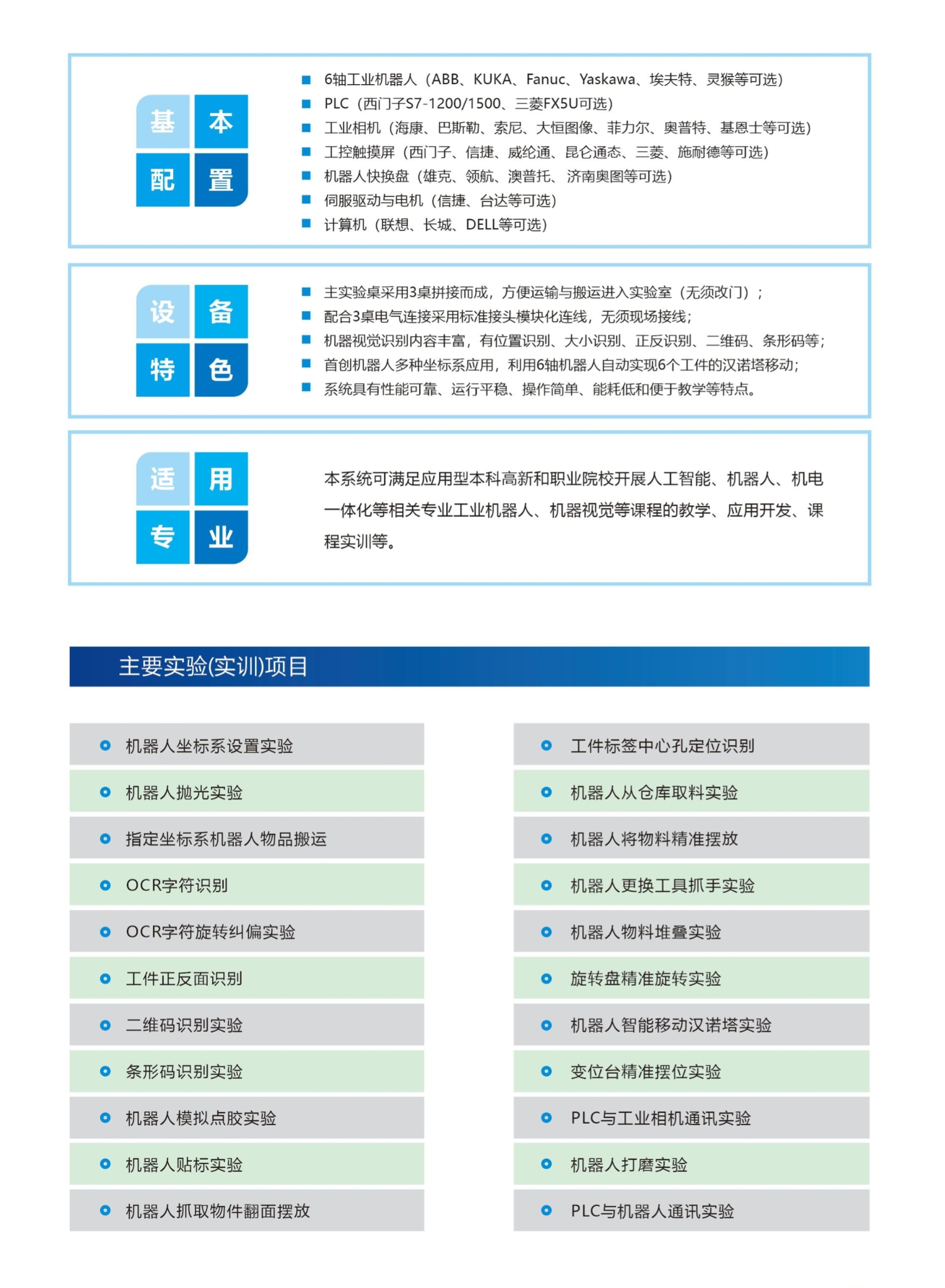 智能制造单元集成与机器人移动汉诺塔实训系统主要由六轴机器人、立体仓库、机器视觉、旋转台、变位机、快换工具单元、汉诺塔移动平台、低压电气、PLC、人机交豆等组件模块组成。