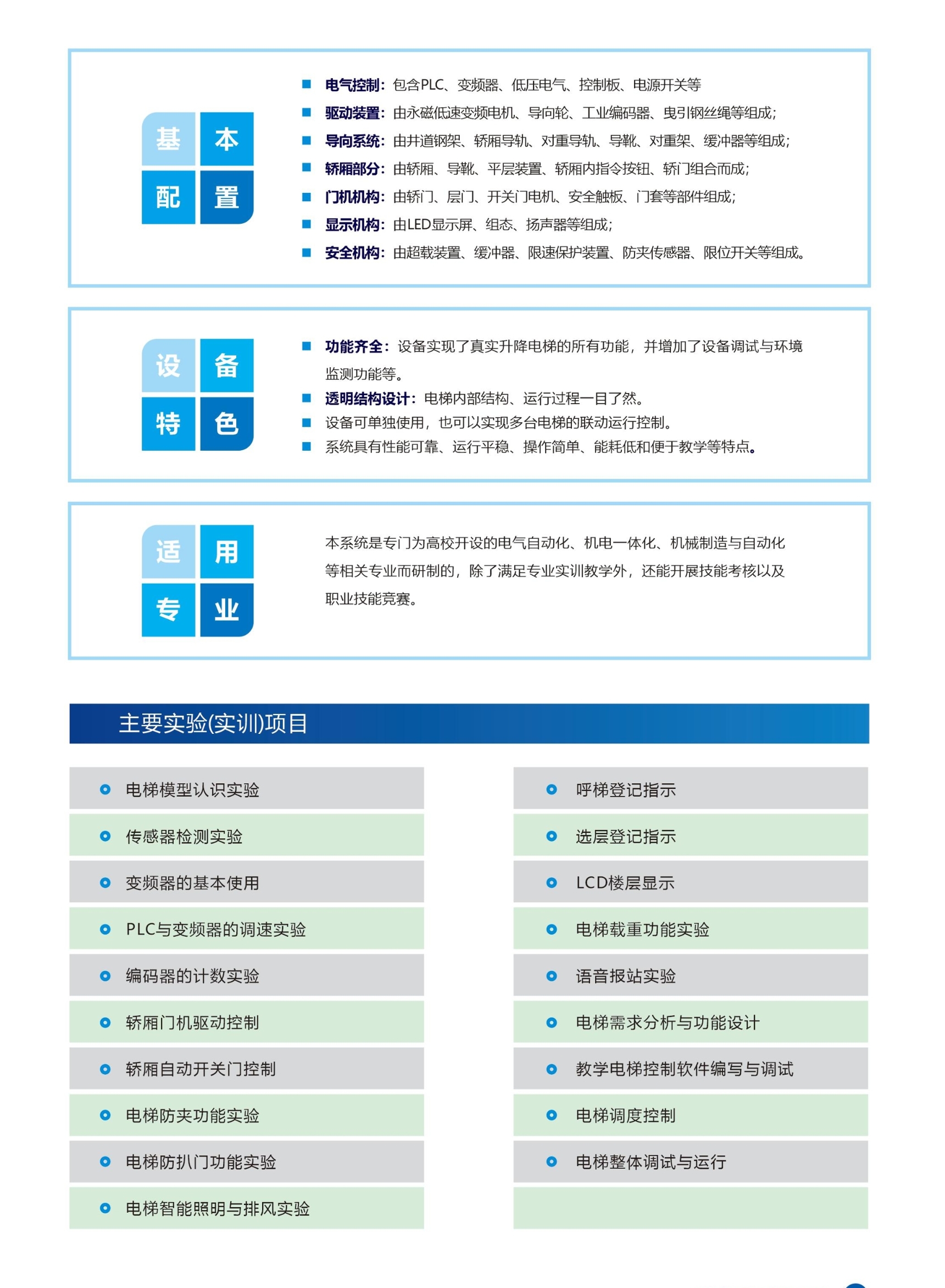 智能电梯实训系统是一套模拟真实电梯控制运行的系统。系统主要模块:三菱FX5U系列PLC、组态、电梯楼层显示、语音播报、电梯变频调速升降、内外按键呼出、环境温湿度测量等。