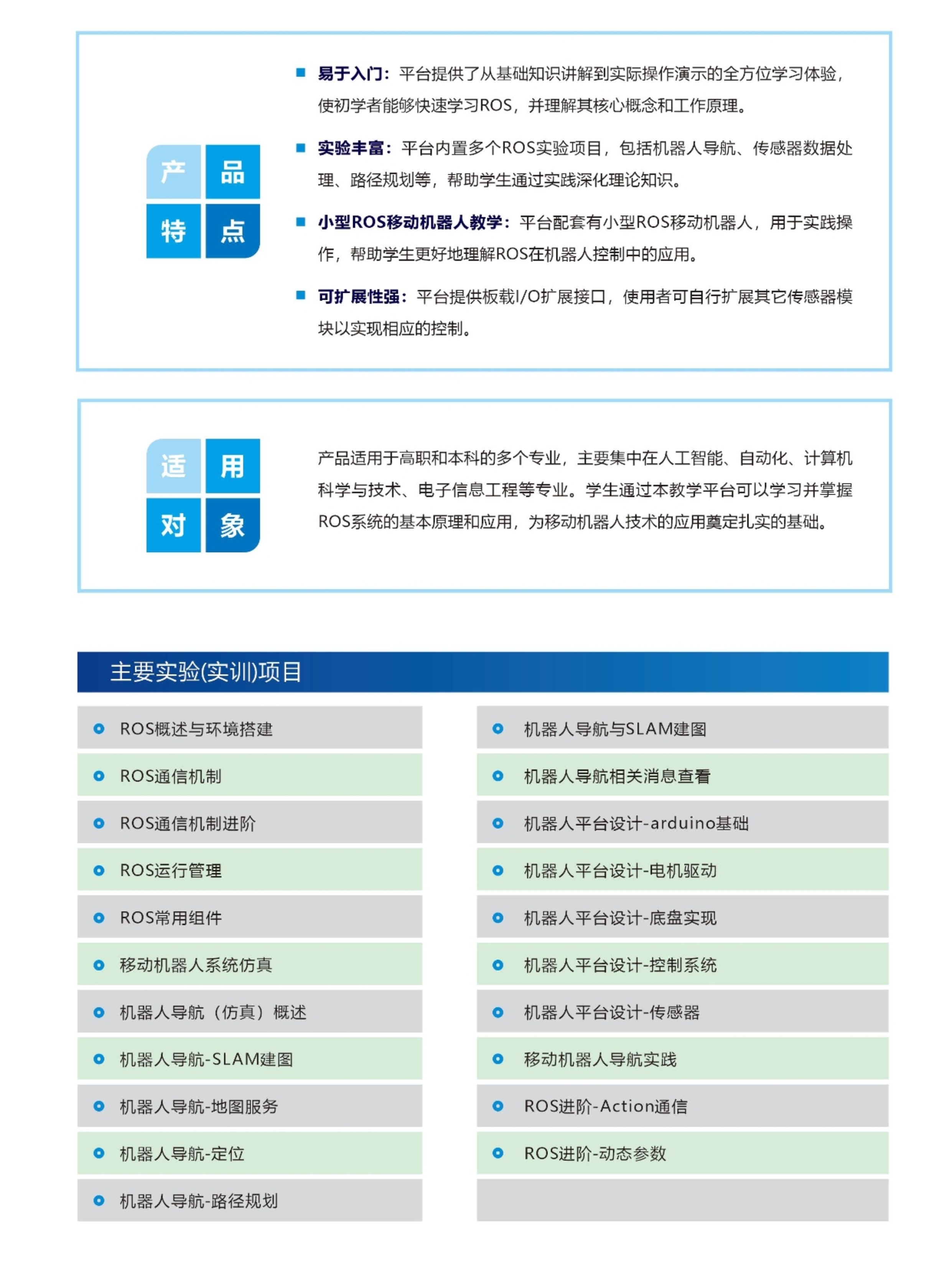 ROS移动机器人学习平台是一款面向高校人工智能、自动化、计算机科学与技术等专业的基础教学设备,是学习人工智能、大数据、云计算、传感与接口、物联网、深度学习等技术的开放式教学平台。