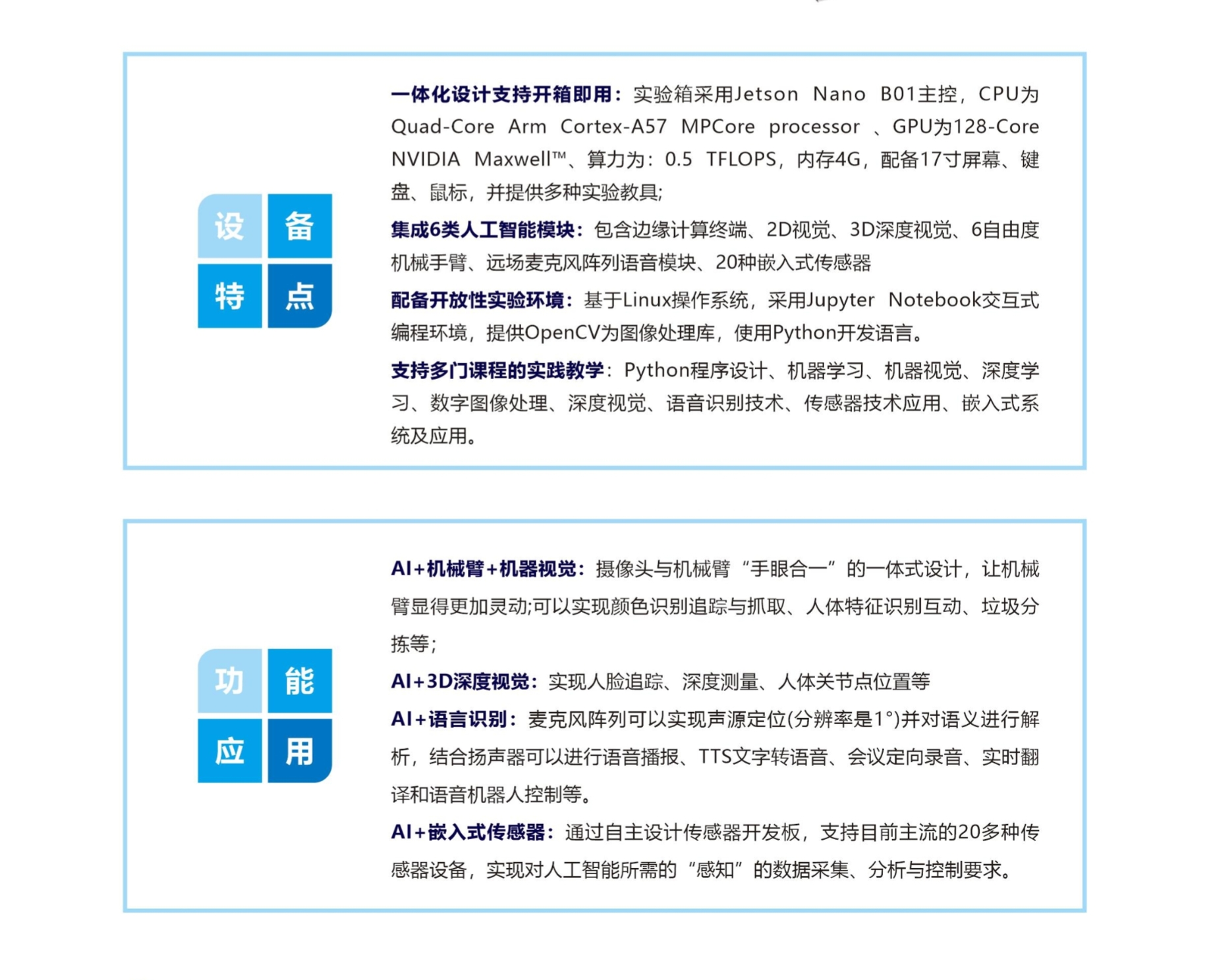 人工智能综合实验箱采用箱式结构一体设计,自带高性能智能处理平台,集成了边缘计算终端、2D视觉、3D深度视觉、机械手臂、语音模块、传感器模块等人工智能课程实验所需的主流组件,支持人工智能专业的9门课程的实验实训。