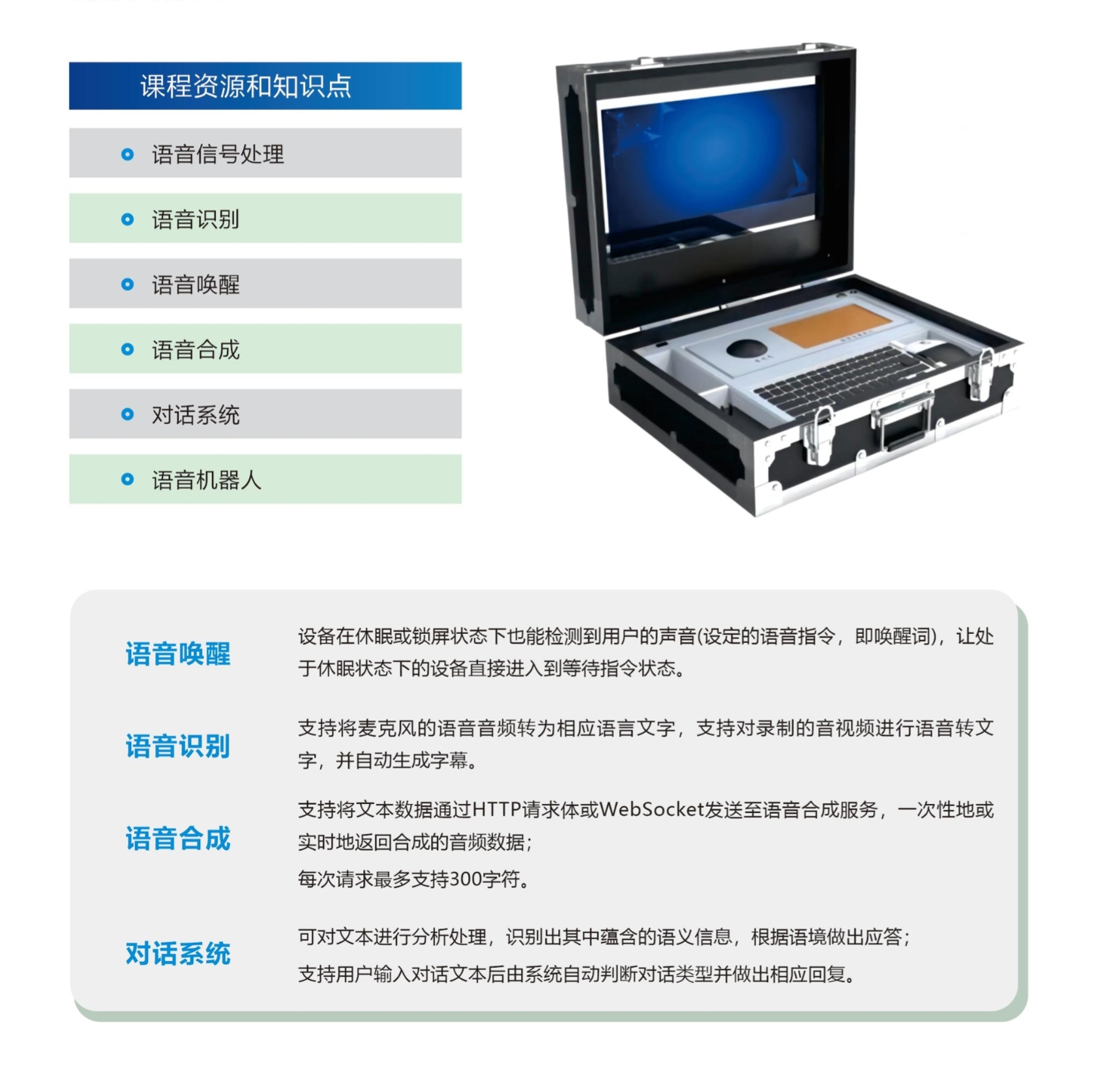 一体化设计,配备17寸屏幕、键盘、鼠标,开箱即用;多种AI能力接入:可提供>10种AI能力的服务系统接入,包含但不限于语音唤醒、机器翻译、语音识别、语音合成、口语评测等