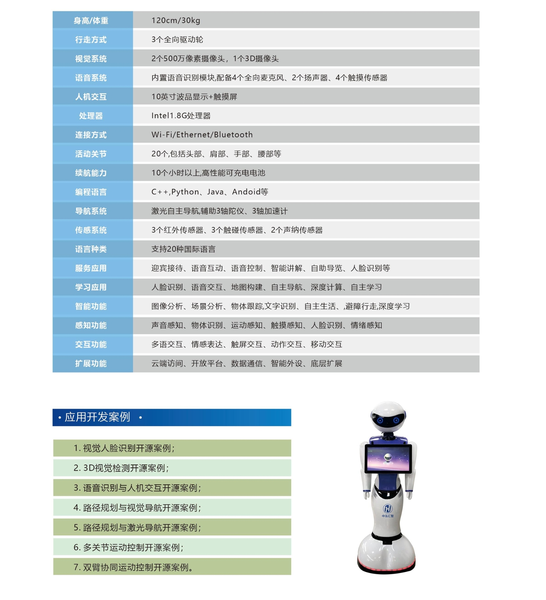 应用开发案例:视觉人脸识别开源案例;3D视觉检测开源案例;语音识别与人机交互开源案例;路径规划与视觉导航开源案例;路径规划与激光导航开源案例;多关节运动控制开源案例等。
