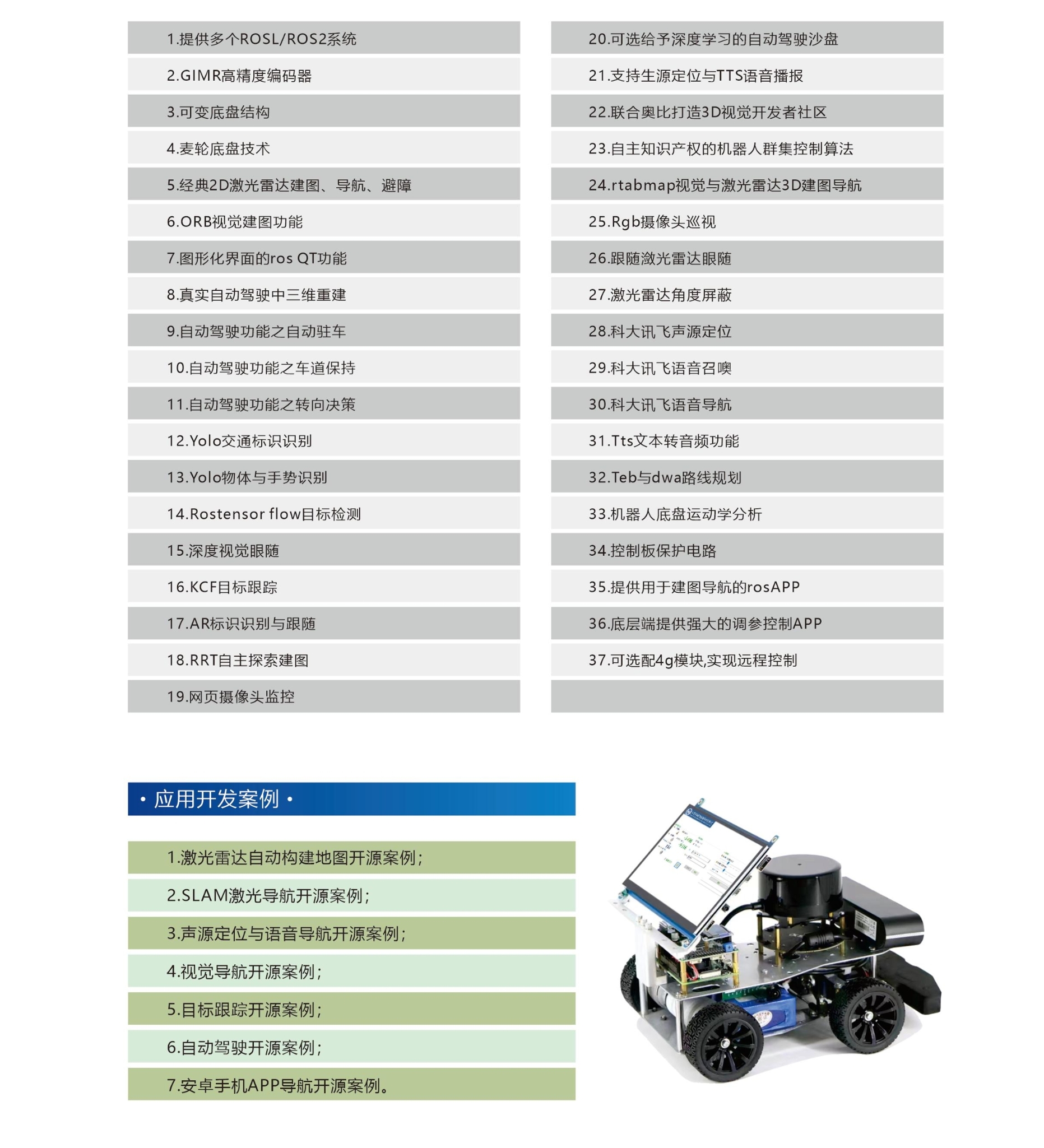 应用开发案例:激光雷达自动构建地图开源案例;SLAM激光导航开源案例;声源定位与语音导航开源案例;视觉导航开源案例;目标跟踪开源案例;自动驾驶开源案例;安卓手机APP导航开源案例。