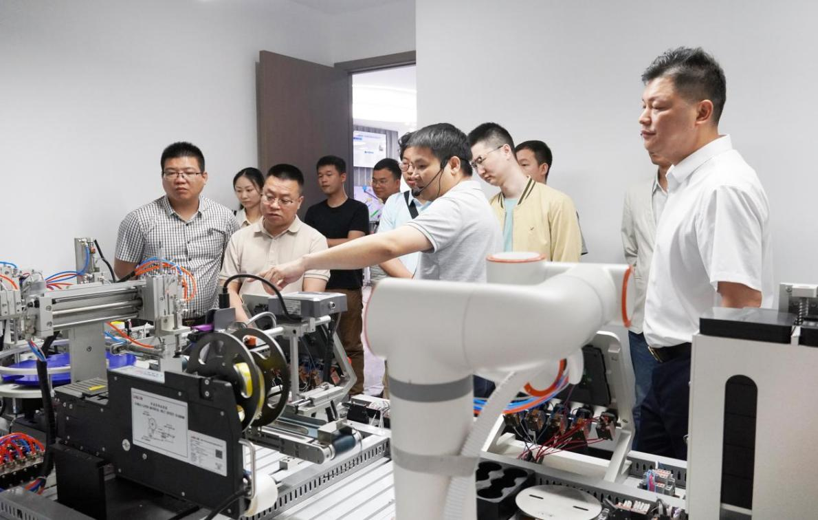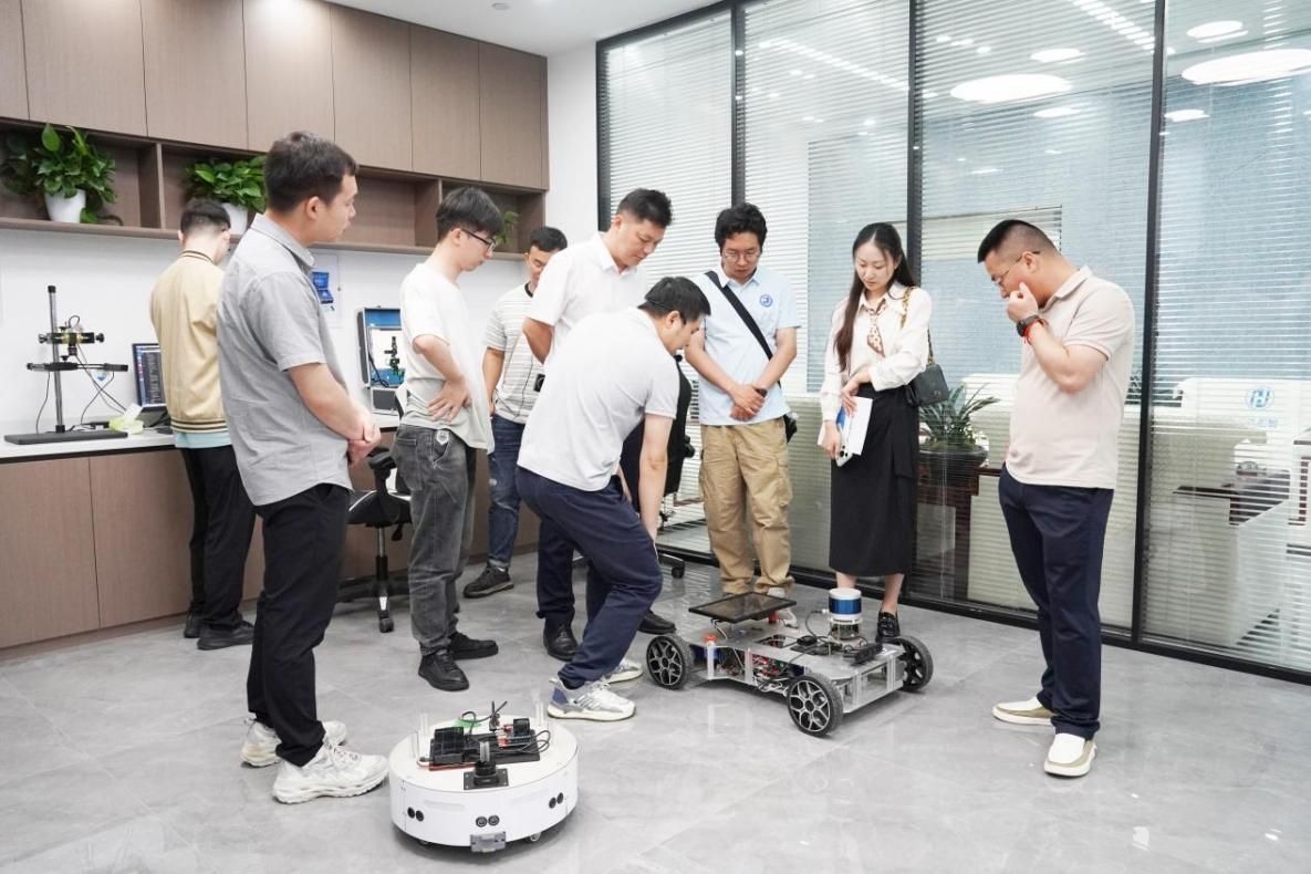随后,考察团参观了公司产品展示中心,重点了解人工智能实验综合管理系统及ROS移动小车等明星产品。在人工智能实验综合管理系统演示区,技术人员详细展示了系统的全流程管理功能,系统以模块化架构和高度集成化设计,为高校人工智能教学提供了“教、学、练、评”一体化解决方案,系统在提升教学效率、强化实践考核等方面的创新应用,获得了考察团高度认可。之后,技术团队演示了ROS移动小车的核心功能,该设备具备自主路径规划、多传感器融合感知、动态避障及多车协同作业等能力,可广泛应用于教学实训、科研项目多场景。在模拟实训场景中,小车精准完成物料抓取、自主导航及任务协作等操作,其灵活性、稳定性和高性价比特性引发考察团热烈讨论。陈孟祥院长高度赞赏我公司成就,并强调了合作潜力和价值。
