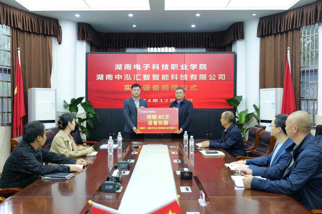 2024年12月11日,湖南中泓汇智智能科技有限公司与湖南电子科技职业学院实训设备捐赠仪式在学院会议室隆重举行。湖南中泓汇智智能科技有限公司总经理,湖南电子科技职业学院相关领导及双方代表共同出席仪式。