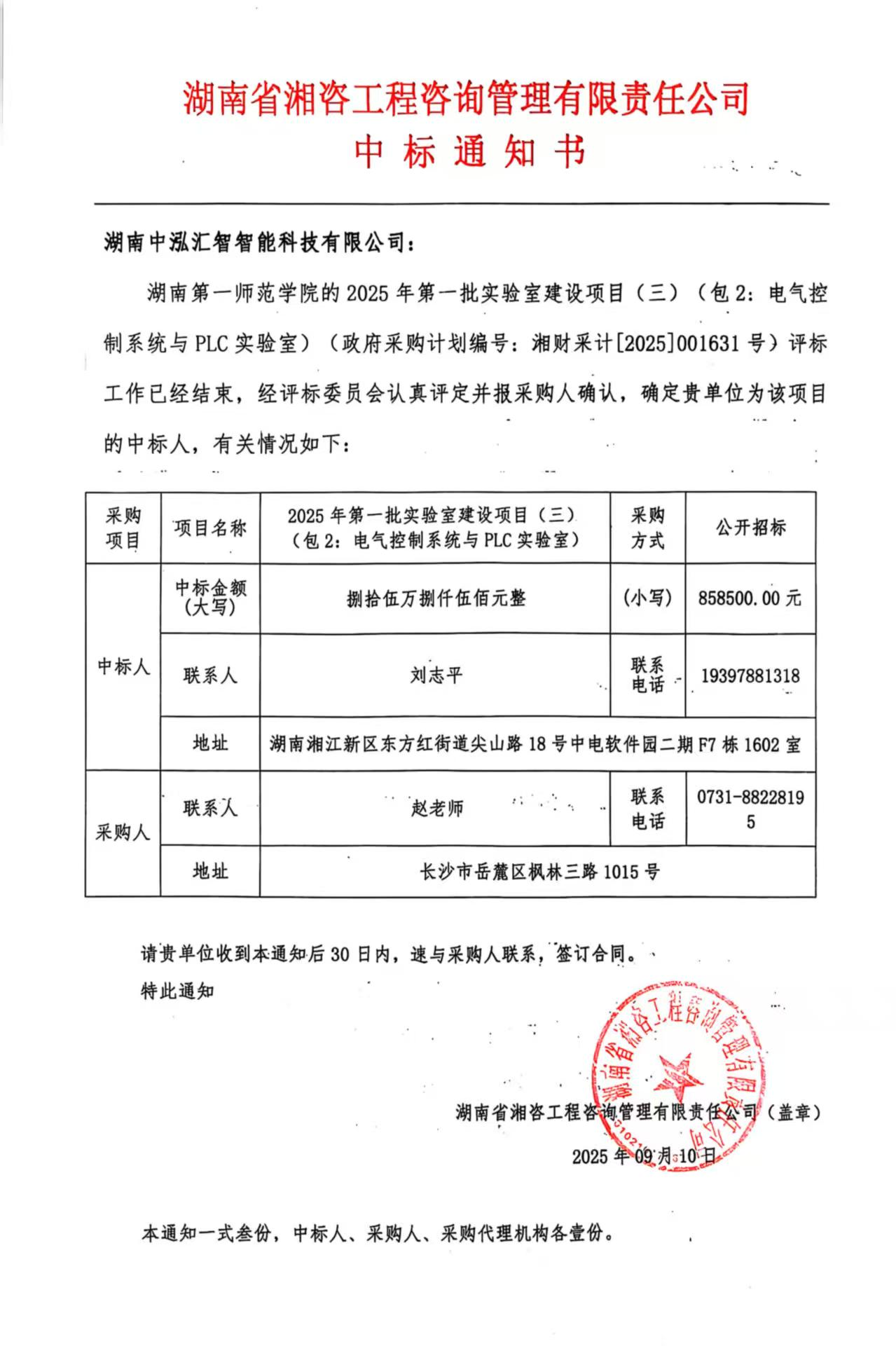近日,湖南中泓汇智智能科技有限公司(以下简称 “中泓汇智”)传来捷报 —— 成功中标湖南第一师范学院 2025 年第一批实验室建设项目(包 2:电气控制系统与 PLC 实验室),中标金额 858500 元。此次中标标志着中泓汇智在教育智能装备服务高校实践教学领域再添重要成果,进一步巩固了公司在该赛道的核心竞争力。